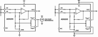 雙極性輸出時AD8205可以測量流過采樣電阻上的雙向電流,這時,輸出可以偏置到輸出范圍內的任意位置。當被檢測的正反兩個方向上的電流為等幅時,其輸出必須偏置到滿量程輸出的中間位置。當雙向電流幅值不對稱時,輸出偏置可以對應地偏離半量程位置。它的兩個參考輸入VREF1和VREF2分別連接一個內部電阻RREF后接到同一個內部偏置節點,這兩個參考輸入端的操作方式完全相同。在兩個參考電壓輸入端接入對應的電壓,即可完成對輸出的偏置。在雙極性輸出方式下,一般有以下兩種連接方式。