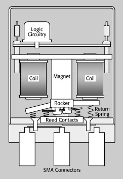 繼電器內(nèi)的容性是限制開(kāi)關(guān)的信號(hào)頻率的常見(jiàn)因素。繼電器的材料和物理特性決定了其構(gòu)成的內(nèi)部電容。比如,在超過(guò)40GHz的射頻和微波開(kāi)關(guān)中,在機(jī)電繼電器中采用了特殊的接觸架構(gòu)來(lái)獲得更好的性能。圖1顯示了一個(gè)典型的構(gòu)造,共同端接位于兩個(gè)開(kāi)關(guān)端接之間。所有信號(hào)的連接線(xiàn)路都是同軸線(xiàn),來(lái)保證最佳的信號(hào)完整性(SI)。在這種情況下,連接器是SMA母頭。對(duì)于更加復(fù)雜的開(kāi)關(guān)結(jié)構(gòu),共同端接被各個(gè)開(kāi)關(guān)端接以放射狀圍繞。