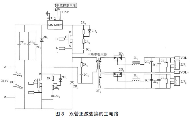 從圖3 可以看出, 電路結構簡單, 容易實現, 并在MOSFET 橋臂增加了霍爾傳感器, 以保證輸出反饋電流環的要求。為了增加電路的通用性, 設計的電路板增加了雙路輸出的功能, 只要改變變壓器的設計, 即可以完成多路輸出。當兩個主功率開關管截止時, 原邊繞組的電壓極性相反, 使另外一橋臂的兩個二極管導通, 電壓被箝位在輸入電壓值。因此開關管承受的電壓與輸入電壓相同。在輸入電壓最大值低于350 V時, 開關管只需要選擇450 V 的耐壓值即可。這里我們選用N 溝道MOSFET , IRF830( 4. 5 A/ 500 V) 。