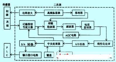 系統主要由傳感器和二次表組成。二次表主要由高頻振蕩器、可編程信號放大器、相敏檢波器、濾波器、幅度鑒別器、agc電路、線性化處理等電路構成。本文就系統關鍵部分電路的原理及作用加以論述。
