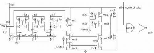 檢測(cè)電流引入到Mc8, 這可采用中的結(jié)構(gòu)完成。然后鏡像到Mc5.當(dāng)主功率管開始導(dǎo)通時(shí), Mc5 和Mc6中的電流鏡像檢測(cè)電流緩緩上升,只要檢測(cè)電流小于此時(shí)所設(shè)定的極限電流, Mc3 和Mc4 就至少有一個(gè)工作在線性區(qū), Mc3 和Mc4 作為一個(gè)整體呈電阻特性。因?yàn)槿鬗c3 和Mc4 已工作于飽和區(qū), 則其電流一定會(huì)鏡像Mc1 和Mc2 中的電流即極限電流。這就會(huì)出現(xiàn)Mc3 和Mc4 中的電流與Mc5 和Mc6 中的電流不等的矛盾。因此, 只有當(dāng)Mc3 和Mc4 中的電流與Mc5 和Mc6 中的電流相等時(shí), Mc3 和Mc4 才工作于飽和區(qū)。