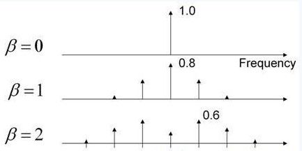 圖1顯示了通過(guò)正弦波改變調(diào)制指數(shù)產(chǎn)生的影響。當(dāng)Β=0時(shí),沒(méi)有出現(xiàn)頻移,只有一條譜線。當(dāng)Β=1時(shí),頻率特征開(kāi)始延伸,且中心頻率分量下降了20%。當(dāng)Β=2時(shí),該特征將進(jìn)一步延伸,且最大頻率分量為初始狀態(tài)的60%。頻率調(diào)制理論可以用于量化該頻譜中能量的大小。Carson法則表明大部分能量都將被包含在2*(Δf+fm)帶寬中。