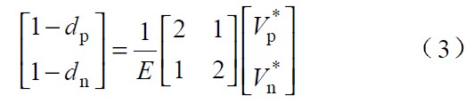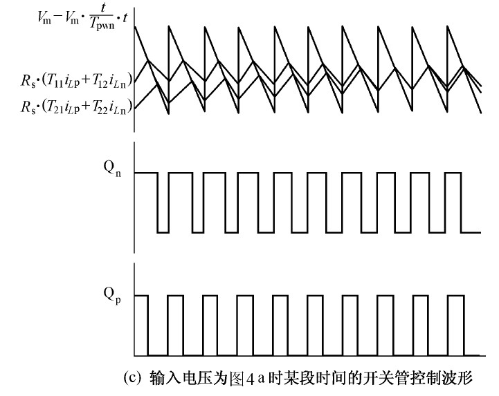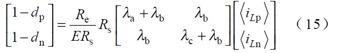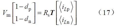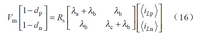 圖中 Vp 、Vn 為不同區(qū)間所對應(yīng)的電壓,Lp、 Ln 和Lt 為不同區(qū)間所對應(yīng)的電感,Tp、 Tn 為不同區(qū)間所對應(yīng)的主控開關(guān),dp 、dn 為主控開關(guān)的占空比。由于PWM 開關(guān)頻率遠(yuǎn)高于電網(wǎng)頻率,因此,在一個(gè)開關(guān)周期內(nèi),各電感的電壓平均值為零,運(yùn)用回路電流法和節(jié)點(diǎn)電壓法對各種開關(guān)狀態(tài)進(jìn)行分,析可得出: