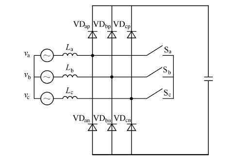 即 van0, vbn0 和vcn0 分別為各相電壓不含零序電壓的部分。由式(6) 和式(7 )可知,各相電流仍能保持低電流畸變。但若(va+vb+vc)/3≠0, 輸入電流和輸入電壓會(huì)存在一個(gè)相位差,從而導(dǎo)致系統(tǒng)不能實(shí)現(xiàn)單位功率因數(shù)。為使系統(tǒng)仍能實(shí)現(xiàn)單位功率因數(shù)的目標(biāo),必須改進(jìn)系統(tǒng)的控制策略。