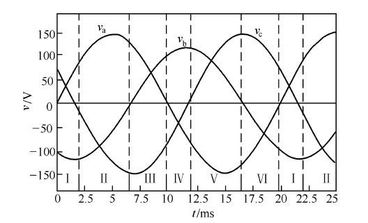 圖 1 給出了雙并聯(lián)升壓型三相整流器的主電路原理圖。另外,圖2 還給出了輸入電壓b 相幅值減少20% ,c 相相位滯后30 °時(shí)三相電壓的波形,并按虛線劃分為六個(gè)區(qū)間。須注意的是,輸入電壓不對稱的情況不同,其分區(qū)點(diǎn)也可能不同,分區(qū)點(diǎn)由各相非零序電壓瞬時(shí)最大幅度區(qū)分點(diǎn)所確定。依據(jù)六階段PWM 控制技術(shù)原理,三相整流器可以通過在線性周期的每一區(qū)間內(nèi)控制兩個(gè)開關(guān)的通斷來實(shí)現(xiàn)單位功率因數(shù)。