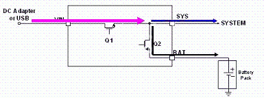 LD6275 具有適應性電源路徑管理(Adaptable Power Path Management, APPM)功能,其為以供給系統端用電為主,對電池充電為輔,如圖3所示;當系統用電超過輸入電源的供給限制時,其電池亦能主動開啟放電功能同時對系統端供給其所需之電能需求,如圖4所示。