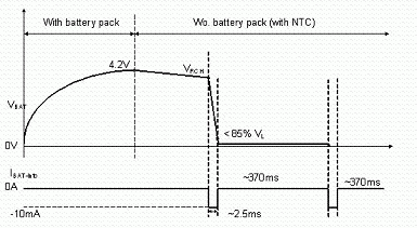 使用者亦有可能在充電或式充電完畢后,在未將電源移除的情況下,即抽離電池的情況。為避免造成危險,IC內部應具有如圖7, 8的電池存在偵測機制。充電IC會以短時間脈沖(每370ms產生2ms的脈沖)方式抽取電池電流,此時若電池存在,則偵測到的電池電壓應大于一預設閥值;若電池已切離,則充電IC偵測到一低電壓,即可判定為電池斷開狀態,并將電池端電壓切斷,保護使用者安全。