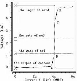 現以圖4為例闡述電流極限比較器的工作情況。此時極限電流為4μA,其虛線代表cascode結構的輸出電壓波形,黑色實線代表反相器的輸出電壓波形即與非門的輸入電壓波形,另外兩條點劃線分別代表cascode結構中Mc3和Mc4的柵電壓波形。