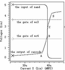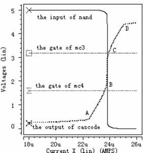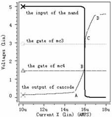 從虛線即cascode結構的輸出電壓波形可以看出,電流極限比較器的工作過程分為五個階段,第一階段:檢測電流從0慢慢上升到A,在此過程中,由于檢測電流遠小于極限電流,強迫Mc3和Mc4都工作于線性區。第二階段:檢測電流從A上升到B,cascode結構的輸出電壓也隨著上升,使Mc4工作于飽和區,Mc3工作于線性區。但是Mc4只是剛剛進入飽和區,還受溝道調制因素影響,這可從圖中很清析地看出當cascode結構的輸出電壓隨檢測電流上升時,Mc4中電流慢慢接近所設定的極限電流。第三階段:檢測電流從B上升到C,此時檢測電流已上升到所設定的極限電流,Mc3和Mc4都工作于飽和區,同時cascode結構的輸出電壓也上升到后面反相器的中點電壓,經過后續控制電路關斷功率管。第四階段:檢測電流從C上升到D,此時檢測電流大于所設定的極限電流,迫使Mc5工作于線性區,雖Mc6還工作于飽和區,但受溝道調制因素影響,另外Mc3和Mc4工作于飽和區。第五階段:檢測電流從D繼續往上升,迫使Mc5和Mc6都工作于線性區,Mc3和Mc4工作于飽和區。從圖4中可以看出,當檢測電流達到4.1μA時,關斷功率管,滿足系統要求。圖5--圖7的工作情況與圖4類似,圖5設定極限電流為16μA,可以看出當檢測電流達到15.97μA時,關斷功率管。圖6設定極限電流為24μA,可以看出當檢測電流達到23.82μA時,關斷功率管。圖7設定極限電流為40μA,可以看出當檢測電流達到39.6μA時,關斷功率管。