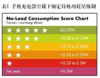 這些關(guān)注的結(jié)果是采取一系列措施來提升效率和降低空載功耗的需求。其中最新最嚴(yán)格的是由全球前五大手機(jī)廠商提出的一項(xiàng)自愿性的充電器星級制協(xié)定,用以標(biāo)志在充電完成之后,充電器仍插在壁式插座上時的耗能量。該星級制從0星級開始,最高5星級。空載下額定待機(jī)功耗大于0.5W的充電器為0星級標(biāo)簽,待機(jī)功耗小于0.03W(30mW)的為5星級(見表1)。通過比較,大多數(shù)現(xiàn)有手機(jī)的待機(jī)功耗在150~300mW范圍。