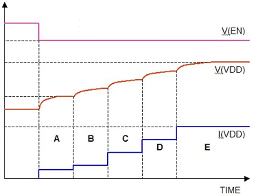 在A部分,通過限制流過分斷開關的電流來減少負載電容充電時的浪涌電流;在B部分,升壓轉換器的開始電流限制在25%;在C部分,電流限制設在50%;在D部分電流限制為75%;在E部分,電流限制為100%。