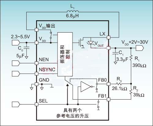 如上所述,當OLED工作在暗的模式時可以通過降低輸出電壓顯著地節省功耗。因此為OLED電源選擇的最佳電源芯片應包含能夠提供這一功能的電路。采用兩條獨立的反饋路徑就可實現這一功能,而且這兩條反饋路徑可以通過簡單的邏輯輸入進行選擇。因此通過這種方法就可簡單地實現PMOLED中使用的亮→暗→關節電技術。