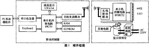 硬件系統(tǒng)主要有移動(dòng)控制器和顯示屏兩部分組成,如圖1所示。移動(dòng)控制器主要負(fù)責(zé)接收PC機(jī)端軟件取摸數(shù)據(jù)、加入控制字符并保存,還能向顯示屏發(fā)送特定控制命令、切換顯示內(nèi)容、改變顯示效果。顯示屏主要有電機(jī)控制轉(zhuǎn)速和單片機(jī)控制E3jLED顯示內(nèi)容等。