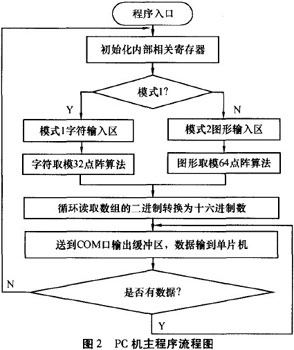 軟件采用實(shí)時(shí)的方式取模:數(shù)據(jù)圖形—數(shù)據(jù)。通過引入圖形這個(gè)中間量,使得提取字模變得靈活,無論任何字體、符號(hào),都可以實(shí)現(xiàn)即時(shí)轉(zhuǎn)換。Pc機(jī)軟件主程序流程圖見圖2。