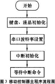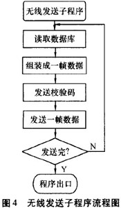 程序上電初始化后,處于等待狀態(tài)。當(dāng)串口中斷一來I臨,優(yōu)先處理串口中斷.發(fā)送無線數(shù)據(jù)是通過鍵盤、菜單控制。移動(dòng)控制器主程序流程圖見圖3;無線發(fā)送子程序見圖4。