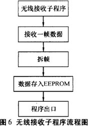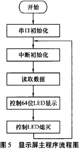 由單片機(jī)控制LED的亮滅和無線數(shù)據(jù)的接收.數(shù)據(jù)通過無線模塊接收后,單片機(jī)的串行接口收到數(shù)據(jù)并傳到主控芯片AT89S8252中處理,當(dāng)有無線數(shù)據(jù)傳到時(shí),優(yōu)先處理接收數(shù)據(jù).顯示屏主程序流程圖見圖5。無線數(shù)據(jù)接收子程序流程圖見圖6。顯示屏能否清晰顯示內(nèi)容主要從以下幾方面考慮:1)單片機(jī)控制LED的亮滅時(shí)間:T=S/V,S為L(zhǎng)ED面寬度,為電機(jī)轉(zhuǎn)動(dòng)線速度;2)電機(jī)轉(zhuǎn)動(dòng)時(shí)軸心保持平衡;3)環(huán)境光線對(duì)比度。