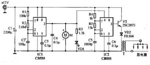 IC1、IC2選用兩塊時基電路CB555,或選用一塊雙時基電路CB556。注意,CMOS時基電路CB7555或CB7556因驅動電流較小,不適合本機使用。開關管VT選用2SC2073等中功率管。二極管VD2選用FR104等快恢復整流管。風扇M可選用12V、150mA左右的計算機CPU用的散熱風扇,其體積較小、厚度薄、噪聲很低,比較適合本制作使用,也可用12V玩具電機配以自制的風扇葉片代用。