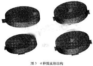 根據以上考慮,實驗中設計了4種不同結構,如圖3所示,中心圓柱體是微反應室腔,頂部的小圓柱體為進液溝道,底部的方形結構為設計的出液溝道,進液口位置有中心和邊緣位置兩種,出液溝道數量有4種。