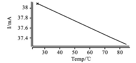 設置Rset為500Ω、Vcc為3V,令電路工作的環境溫度為25℃~85℃時,恒流輸出情況如圖6.驅動電流由37.3mA變化到38.1mA,波動百分比2.14%.