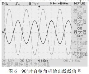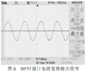 根據(jù)圖中所示,在確定的角度下,自整角機三路線線信號在電壓上呈120°正弦關系,接口電路轉(zhuǎn)換輸出信號為兩路電壓正交信號,根據(jù)角度不同,兩路信號電壓峰值不同,單路最大時電壓為2Vrms。測試結(jié)果完全符合設計要求。