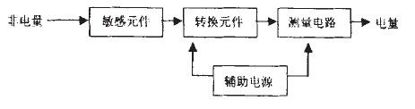 傳感器是將各種非電量(包括物理量、化學量、生物量等)按一定規律轉換成便于處理和傳輸的另一種物理量(一般為電量)的裝置。傳感器一般由敏感元件、轉換元件和測量電路三部分組成,有時還需外加輔助電源。 傳感器方框圖如圖1所示。