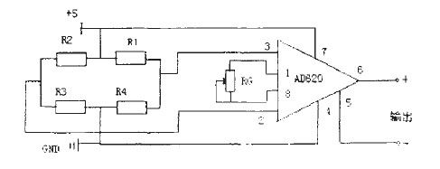 我們選用的高精度低噪聲儀用放大器AD620,可以用在傳感器輸出信號小的放大器中,如光電池傳感器、應變片傳感器以及壓力傳感器等。由于它具有低噪聲、增益精度高、增益溫度系數小和高線性度等優良性能。用于此系統中是非常理想的。AD620是一種只用一個外部電阻就能設置放大倍數為1-1000的儀表放大器,具有良好的直流性能和交流性能,AD620的體積小、功耗低成為應用在壓力傳感器中的重要因素,傳感器信號放大電路如圖5所示。
