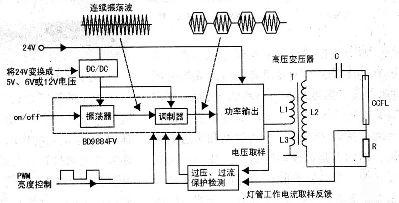 加電后,當背光燈驅動板收到CPU送來的“ON”信號(常見為高電平啟動,多為3V~5V)后,控制振蕩器開始工作,產生頻率為30kHz~lOOkHz的振蕩信號送入調制器內部,對CPU送來的PWM亮度調節(jié)信號進行調制,調制后輸出斷續(xù)的30kHz~lOOkHz激勵信號驅動功率輸出電路,經高壓變壓器升壓后輸出高壓并點亮背光燈管。