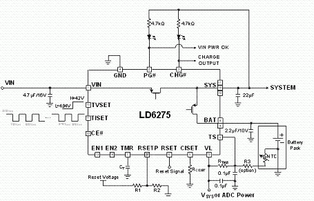 為滿足低耗電可攜式產品對于更精確、更安全的充電器應用需求,許多IC制造商發展出低成本線性充電器。圖2是以通嘉科技的LD6275充電IC為設計范例,構成僅需少數外部零件的獨立式線性充電器電路,其具備1.5A的最大充電電流。
