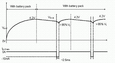 使用者亦有可能在充電或式充電完畢后,在未將電源移除的情況下,即抽離電池的情況。為避免造成危險,IC內部應具有如圖7, 8的電池存在偵測機制。充電IC會以短時間脈沖(每370ms產生2ms的脈沖)方式抽取電池電流,此時若電池存在,則偵測到的電池電壓應大于一預設閥值;若電池已切離,則充電IC偵測到一低電壓,即可判定為電池斷開狀態,并將電池端電壓切斷,保護使用者安全。
