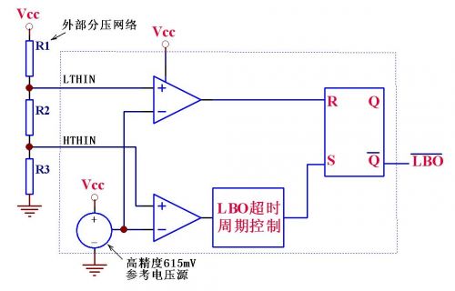 IC內含一個高精度的615mV基準電壓源、兩個比較器、一個RS觸發器和其它一些邏輯電路,其大致功能是:VCC電壓或其它待檢測電壓通過R1-R3組成的分壓網絡接在IC的LTHIN /HTHIN檢測引腳,當待測電壓下降導致LTHIN引腳低于615mV時,輸出腳LBO輸出低電平,而如果待測電壓上升導致HTHIN引腳高于615 mV時,經過內部邏輯判斷和簡單延時后,輸出腳LBO輸出高電平。