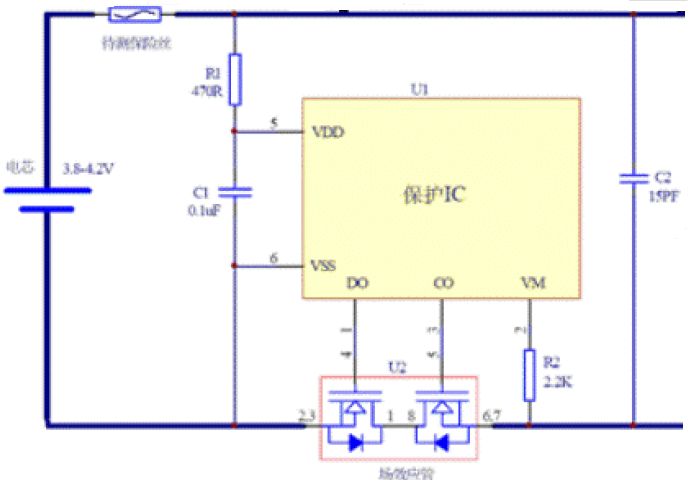 保護IC失效電路示意圖如圖2所示,此時保護IC對短路不能起到保護作用,當負載出現短路時候需要保險絲快速熔斷。