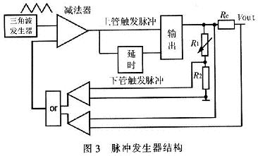 系統(tǒng)采用了電流負(fù)反饋電路,以適應(yīng)激光二極管的要求。當(dāng)負(fù)載變化,電流略大于給定電流時(shí),減小ton寬度,電壓降低。電流略小于給定電流時(shí),增加ton寬度,這樣可以維持電流穩(wěn)定。圖3所示為脈沖發(fā)生器結(jié)構(gòu)。