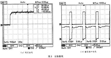實(shí)驗(yàn)曲線(xiàn)如圖5所示,實(shí)驗(yàn)數(shù)據(jù)為輸入電壓12 V,輸出電壓2 V左右,測(cè)量電阻0.0025 Ω,最大輸出電流20 A。