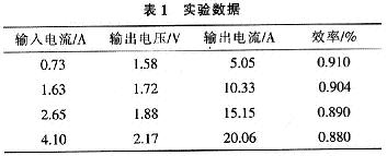 實(shí)驗(yàn)中用50 A的2個(gè)二極管串聯(lián)作為負(fù)載,輸入電壓12 V時(shí),不同電流下輸出及效率如表1所示。