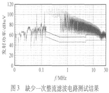 缺少一次整流濾波電路的測試結果如圖3所示,從圖3可以看出, 這個超標的頻率點不是單一的而是覆蓋了整個頻段。為了濾除這些干擾, 將電流的畸變減小到最小, 就需要在整流過后增加一級濾波電路。