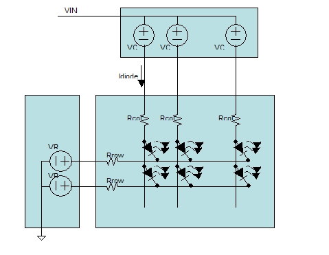 其中:V二極管是二極管的前向壓降;I二極管是流經二極管的電流;Rcol是列連接的電阻;Rrow是行金屬的電阻;VCD是列驅動器所需的開銷;VRD是行驅動器所需的開銷;在典型應用中,VIN大約為20V。