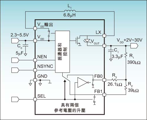 如上所述,當OLED工作在暗的模式時可以通過降低輸出電壓顯著地節省功耗。因此為OLED電源選擇的最佳電源芯片應包含能夠提供這一功能的電路。采用兩條獨立的反饋路徑就可實現這一功能,而且這兩條反饋路徑可以通過簡單的邏輯輸入進行選擇。因此通過這種方法就可簡單地實現PMOLED中使用的亮→暗→關節電技術。