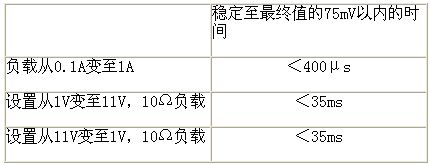 瞬態響應的測試需要對負載阻抗和電源設置施加較大的階躍變化,并測量穩定至最終值的時間(如表1)。吉時利全部2200系列電源的電壓瞬態響應都給出了三個條件:增大負載,提高設置和降低設置。