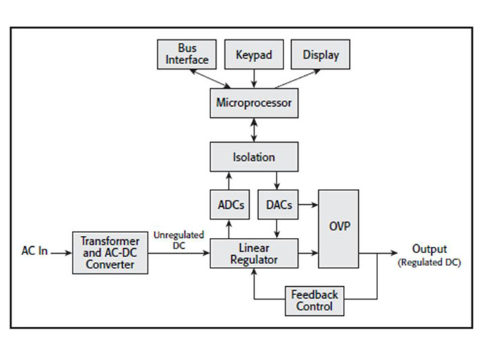 歷史上,直流電源用戶使用電位計設置輸出電壓或電流。今天,微處理器從用戶接口或遠端接口接收輸入。數模轉換器(DAC)接收數字設置,將其轉換為模擬值并用作模擬調節器的參考。設置分辨率和準確度的值由轉換質量和調節過程決定。