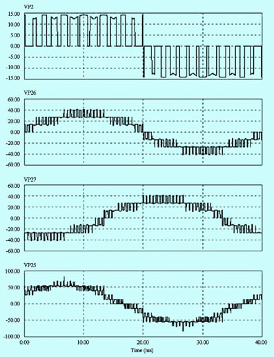它們分別是A相單臺矩陣變換單元輸出電壓、A相輸出總電壓、B相輸出總電壓和A-B總輸出線電壓的波形圖。