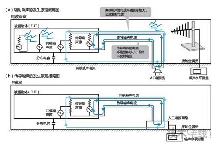 本圖為傳導噪聲的測量情形。該測量的屏蔽室內進行。具體的測量條件由“CISPR16-2”或“ANSI63-4”等規格規定。