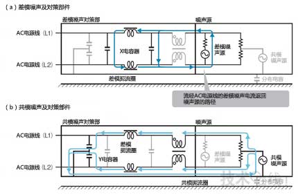 為抑制差模噪聲,利用差模扼流圈和X電容,在產品內形成使流經AC電源線的差模噪聲電流返回噪聲源的路徑(a)。如果是共模噪聲,一般使用Y電容來抑制噪聲,不過在照明產品的電源電路中,其效果不充分。因此通過在Y電容上追加共模扼流圈或僅利用共模扼流圈來抑制共模噪聲(b)。