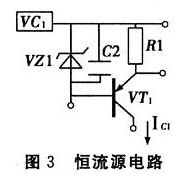 如圖3所示,由穩(wěn)壓管VZ1、晶體管VT1、電阻R1、電容C2構(gòu)成的晶體管電流源提供恒定電流,取穩(wěn)壓管電壓為5 V,R1為51 Ω,此時(shí)IC≈1OO mA,作為電路的充電電流。