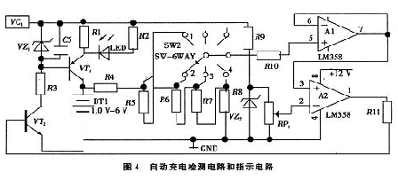 如圖4電路所示,自動(dòng)斷電電路是由三極管VT2、電壓跟隨器A1、電壓比較器A2電阻R4、R5、R6、R7、R8、R11和可變電阻RP1構(gòu)成。當(dāng)充電開始時(shí),電壓比較器輸出高電平,VT2導(dǎo)通,VT1也導(dǎo)通,指示燈發(fā)光二極管亮,給電池充電。可以先設(shè)定轉(zhuǎn)換開關(guān)為1時(shí)給一節(jié)電池充電,轉(zhuǎn)換開關(guān)為2時(shí)給二節(jié)電池充電,依次類推,實(shí)現(xiàn)對(duì)1-4節(jié)電池充電。當(dāng)電充滿時(shí),電壓比較器輸出低電平,VT2截止,VT1不導(dǎo)通,發(fā)光二極管熄滅,充電完畢。[page]
