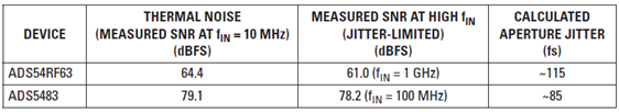 我們知道時鐘源生成器濾波后輸出的外部時鐘抖動為 ~35 fs,因此我們可以利用測得的 SNR 結果,然后對第 1 部分(請參見參考文獻 1)中的方程式 1、2 和 3 求解孔徑抖動值,從而計算得到 ADC 孔徑抖動,請參見下面的方程式 4。表 3 列舉了每種 ADC 測得的 SNR 結果以及計算得孔徑抖動。
