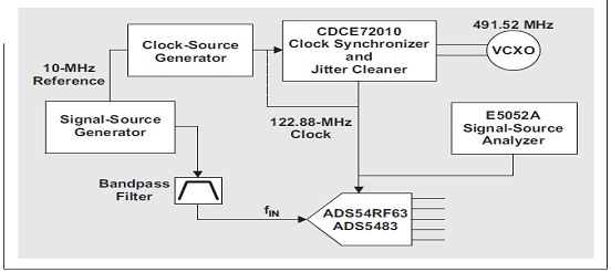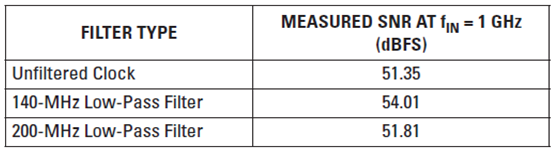 為了證明未濾波時鐘信號的相位噪聲需要積分至約兩倍采樣頻率,我們實施了如下試驗:在 CDCE72010 輸出和 ADS54RF63 時鐘輸入之間添加不同的低通濾波器。
