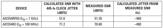 通過在時鐘輸入通路中安裝低噪聲 RF 放大器,兩個數據轉換器重復進行了高輸入頻率的 SNR 測量,其結果如表 5 所示。我們可以看到,測得 SNR 和預計 SNR 匹配的非常好。使用下面的方程式 5,計算得到的時鐘抖動值在 90-fs 時鐘抖動的 5 fs 以內,其結果通過相位噪聲測得推導得出。