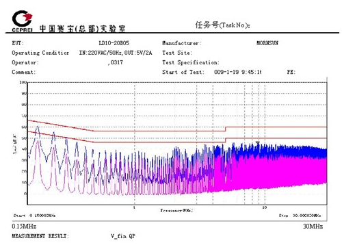 5. 具有較低的EMI性能。EN55011有l(wèi)evel B,level A兩個等級,level B比level A嚴苛得多。圖2、圖3是LD10產(chǎn)品的EMI測試數(shù)據(jù),該數(shù)據(jù)由國家電子五所專業(yè)測試。測試結(jié)果可以看出,該系列電源具有較低的電磁輻射性能,達到EN55011,level B的要求。