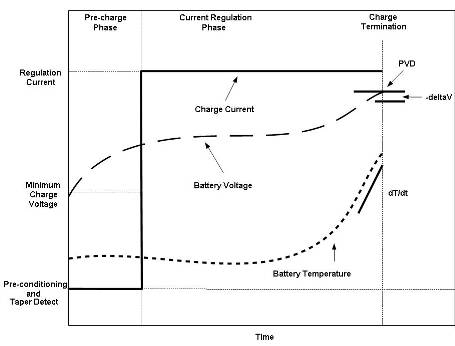 當電池溫度和電壓正確時快速充電開始。通常用 1C 或更低的恒定電流對 NiMH 電池進行充電。一些 NiCd 電池可以用高達 4C 的速率進行充電。采用適當的充電終止來避免有害的過充電。
