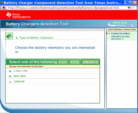 電池充電器工具使得設計人員選擇正確的充電器的過程更輕松。圖 3 是 TI 網站上提供的一種工具的示例。